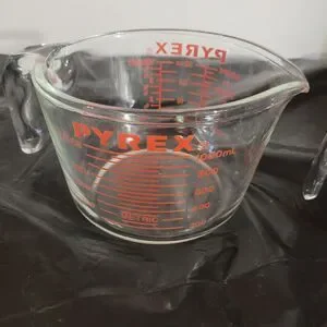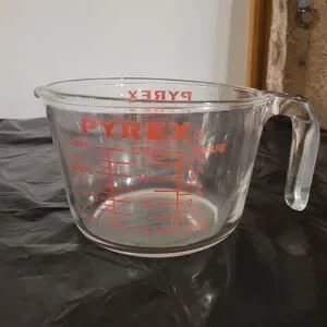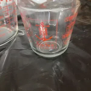 This product is a set of two vintage glass measuring cups, one with a 4 #532 Quart capacity and the other with Anchor Hocking a 1 cup capacity. The cups are round in shape, medium in size, and clear in color. Made in the United States in the 1980s, these original Pyrex measuring cup are perfect for collecting or adding to your kitchen tools. The set includes an opener and a handle made of open glass, making them both functional and stylish for any kitchen.