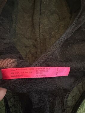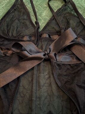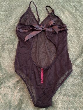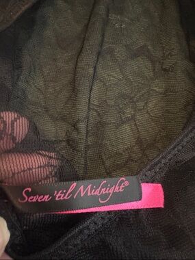 Seven Till Midnight sheer teddy bodysuit. This has sheer floral lace and satin bows. Pull on style, with adjustable spaghetti straps. Color is black and itemized is in good pre-owned condition. Approximate length from top of strap to crotch is 26”