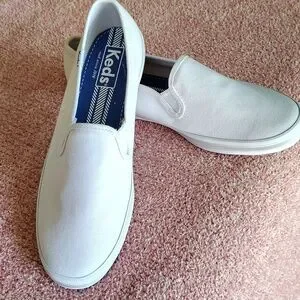 Simple white canvas slip-on loafers by Keds. Elastic side panels for easy on and off. Low-profile rubber sole for everyday wear. Clean, versatile style pairs with casual looks. Purchased,never worn. Perfect.