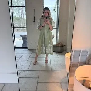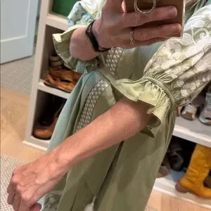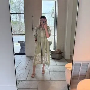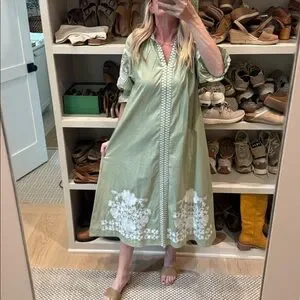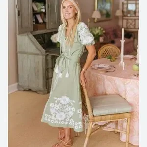 From their capsule wardrobe collection, 2025, Sage green midi dress with white floral embroidery. Puff sleeves and a tie waist with tassels. Lightweight, feminine silhouette. Elegant white embroidered hem and bodice details. Worn once!