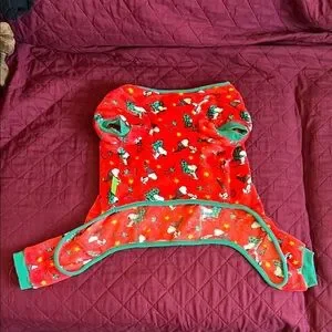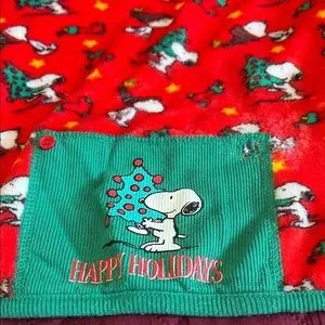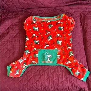Festive Peanuts dog pajamas with Snoopy print. Soft fleece fabric. Green trim and pocket detail. Bright holiday colors. Cute seasonal design for medium dogs.
