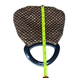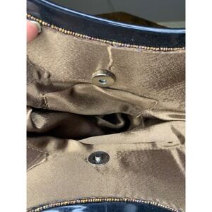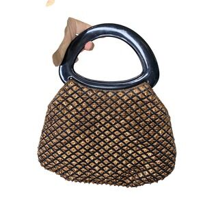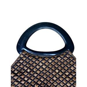 Showstopping style arrives in this vintage evening bag, ready to elevate any ensemble with its shimmering allure. Adorned with intricate beadwork and dazzling sequins arranged in a geometric pattern, the purse catches the light from every angle, making it a true statement piece. The glossy black top handle adds a touch of modern elegance, while the secure magnetic closure keeps your essentials safe. A compact interior, lined with a smooth fabric, is perfect for carrying your phone, keys, and lipstick. Perfect for cocktail parties, special events, or a night out on the town, this bag will make you feel glamorous and confident. Flaw missing one sequins in diamond on backside. I almost missed it.