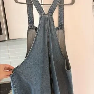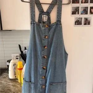 Casual denim pinafore with front wooden-style buttons. Adjustable shoulder straps and front patch pockets. Classic light blue denim look. Versatile everyday style.
