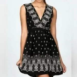 Chic mini dress with bold geometric patterns. Features a deep V-neck and sleeveless design. Perfect for stylish outings.