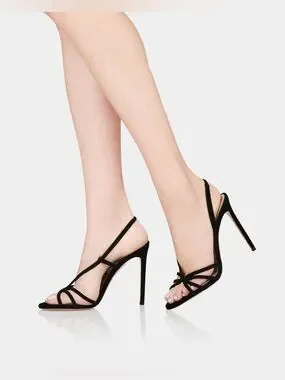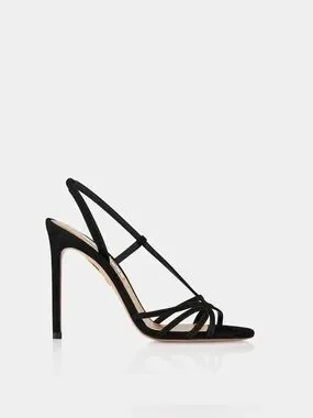 Elegant strappy silhouette with delicate knot detailing. Slim stiletto heel for a chic profile. Slingback strap secures the foot. Luxurious suede upper for refined style.