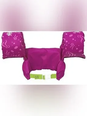 Bright pink kids swim float with a playful cat graphic. Provides secure arm floatation and comfortable chest support. Easy to wear and designed for confident water play. Features fun seaweed and bubble accents in the print.