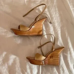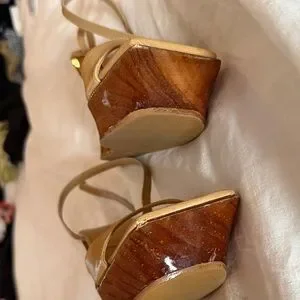 Elegant tan wedge sandals with a glossy wooden platform. Strappy ankle detail offers a secure, feminine fit. Smooth leather-like upper provides comfortable wear for day or evening. Neutral tan color pairs easily with many outfits.