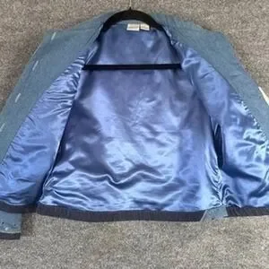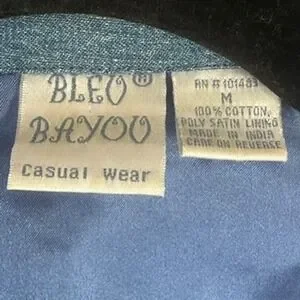 Bleu Bayou casual wear jacket showcases an intricate patchwork design with various denim shades, floral patterns, and eyelet embroidery details. This button-front piece features a classic collar and a smooth blue poly satin lining for comfortable layering. The mixed-media construction includes textured fabrics and subtle sequin accents that add a touch of sparkle to the artisanal, bohemian aesthetic.
