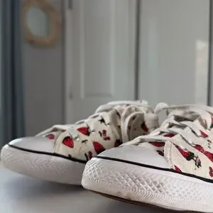 Converse strawberry sneakers, cherry print shoes, fruit print Converse, kawaii sneakers, cute casual shoes, low top canvas sneakers, women’s Converse 8.5, spring sneakers, summer shoes, playful fashion