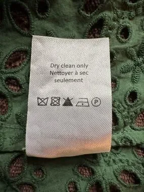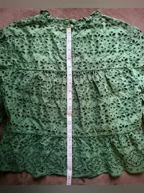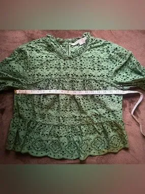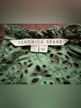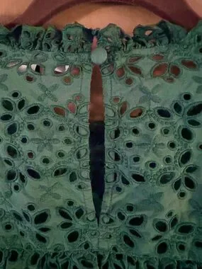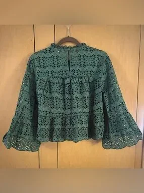 Beautiful, authentic Veronica Beard Emmalyn top in highly sought after forest green, 🌟a very rare find!🌟 This is a standout piece from the Spring 2022 collection, featuring intricate floral eyelet embroidery throughout. It has a feminine, voluminous silhouette with a high ruffled mock neck and dramatic flounced bell sleeves.