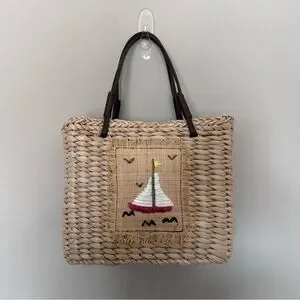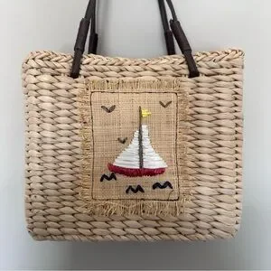 Woven Straw Tote Bag with Sailboat Embroidery - Natural