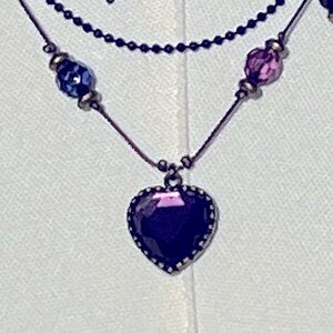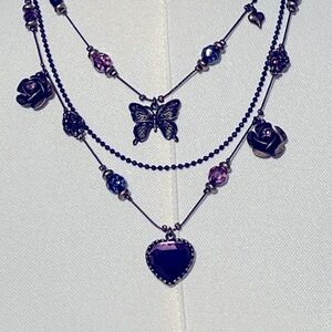 * Antique brass, layered necklace with butterflies, roses, purple and blue beads, and a purple crystal heart pendant.