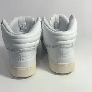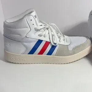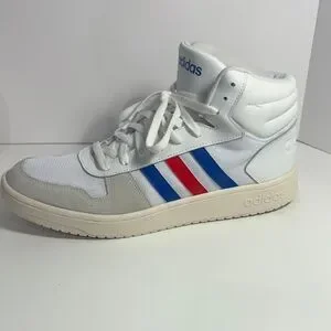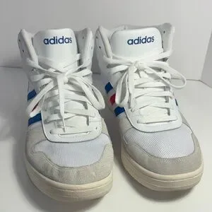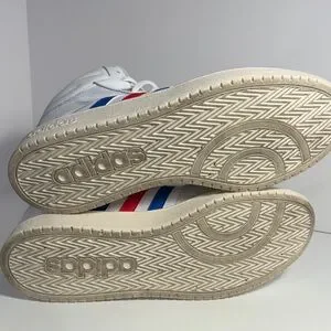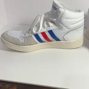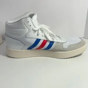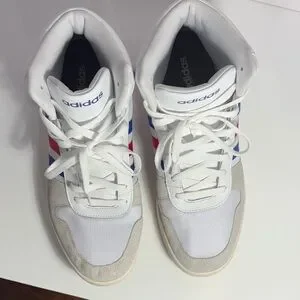 Classic adidas high-top athletic shoes. White upper with blue and red stripe accents. Cushioned midsole for comfort. Lace-up closure for a secure fit. Versatile style for casual wear.