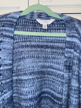 Open-front knit cardigan in a blue marled pattern. Long sleeves and relaxed silhouette for layering. Soft textured knit with subtle stripe variation. Casual, easy-to-wear piece for everyday outfits.