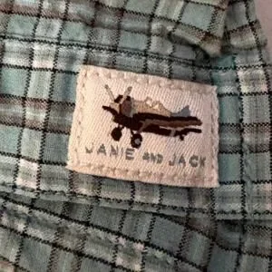 Classic Janie and Jack long sleeve button-down shirt features a timeless plaid pattern in shades of teal, blue, and brown. Crafted from 100% cotton, this durable top includes two functional chest pockets with button closures and a subtle airplane patch near the hem for a touch of charm. The pointed collar and buttoned cuffs provide a polished look suitable for family gatherings or everyday smart-casual wear. Pairs effortlessly with chinos or jeans for a versatile boys wardrobe staple.