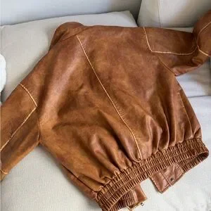 Relaxed bomber silhouette in warm cognac faux leather. Snapped cuffs and classic collar for simple structure. Easy layering piece with a casual, polished look. Oversized fit