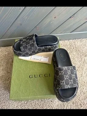 Authentic Gucci monogram slide sandals. Signature GG pattern across the strap. Black footbed with matching monogram platform. Easy slip-on style. Stylish and versatile.