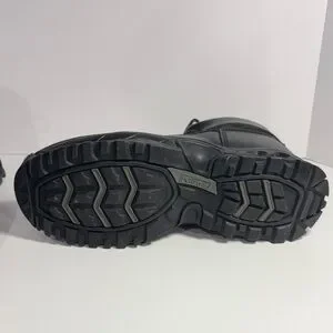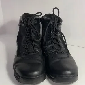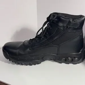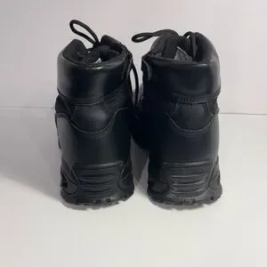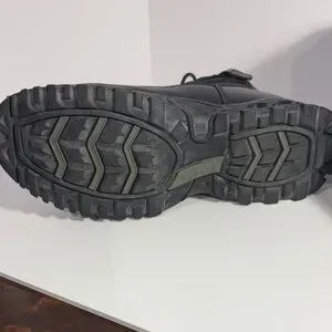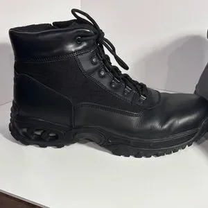 Durable black men's tactical boots with secure lace-up design. Comfortable padded collar and supportive sole for all-day wear. Easy to style with work or casual outfits. Black color offers a versatile, professional look.