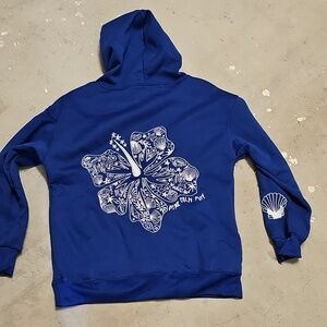 Soft royal blue pullover hoodie. Small white palm tree graphic on chest. White shell print on sleeve. Kangaroo pocket and hood. Casual, beach-inspired look.