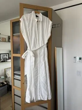 Lightweight white shirt dress with a relaxed fit. Button-front placket and a removable self-tie waist. Short capped sleeves and a classic collar. Clean, airy look for versatile wear.