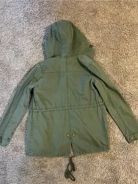Lightweight hooded anorak in olive green. Front zipper and snap closure. Adjustable drawcord waist and hem. Functional front pockets. Versatile layering piece.