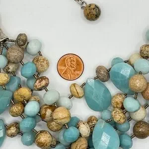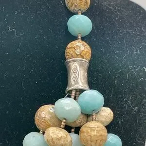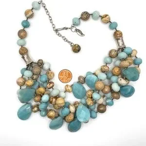 This is an Inca brand necklace -- a beautiful, weighty necklace of natural stone with sterling silver. Has a drop of about 7 1/2" with an additional 3" of extender chain. Hook closure. The blue and brown stones are faceted. This is a pretty combination of stones and silver. Pre-owned in very good condition. This is definitely a statement piece. Beachy colors. It is weighty. The hook clasp is stamped 925.