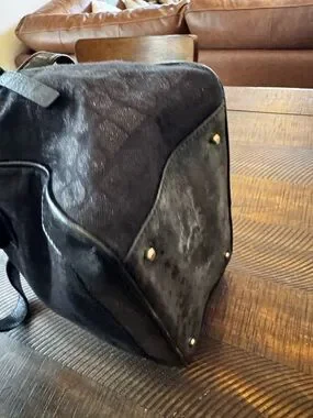 • Hardware: Gold-tone accents, including strap connectors and a center logo.