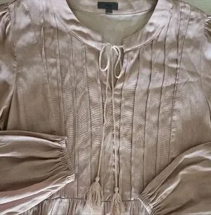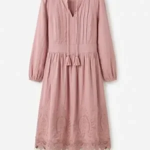 A soft pink midi dress with pintuck detailing for a refined look. Long sleeves and a tie waist with tassels create a flattering shape. Subtle embroidered hem adds feminine texture. Lightweight and versatile for everyday wear or dressier occasions.