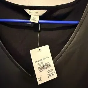 Chic faux leather front with soft knit sleeves. V-neckline adds flattering shape. Pullover style for easy wear. Versatile for day or night.