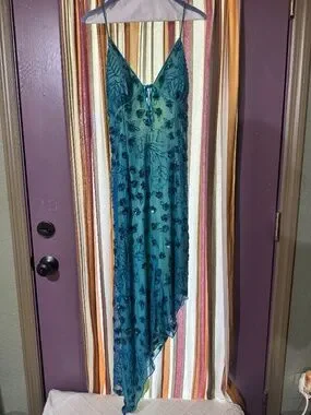 VNTG Caché 100% SILK Beaded Fairy Gown Y2K Teal Blue Handkerchief Hem SZ 6