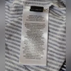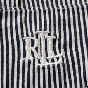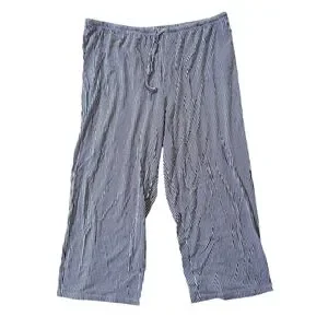 Two-piece striped pajama set with short-sleeve button-up top and matching pants. Classic navy and white pinstripe design. Soft, relaxed fit for lounging or sleep. Made from cotton and viscose so they are super soft and comfortable. Minor wash wear.
