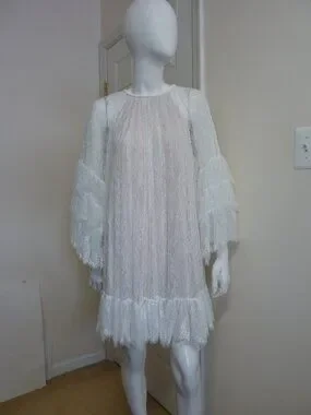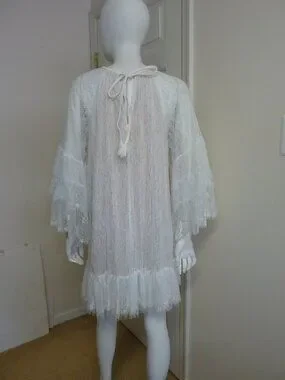 Crafted of delicate lace, the Delia tunic minidress from Alice + Olivia is styled with long tiered sleeves, braided trim, and a ruffled hem.