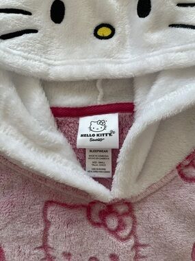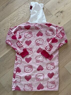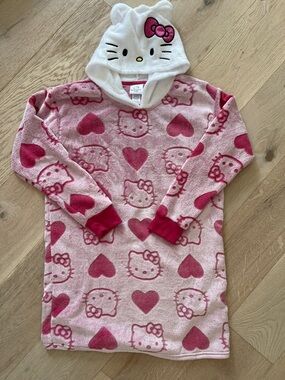 Cozy Hello Kitty hooded fleece nightshirt. Plush pink body with darker pink hearts and Hello Kitty faces. White hood features Hello Kitty face and bow. Long sleeves with darker pink cuffs. Soft and warm for bedtime or lounging.