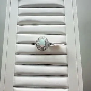 Delicate opal oval center with soft blue-green flash, surrounded by a sparkling halo of accent stones. Set on a polished sterling-colored band for refined everyday elegance. Ideal for gifting or special moments, showcasing the pale blue-green opal color.