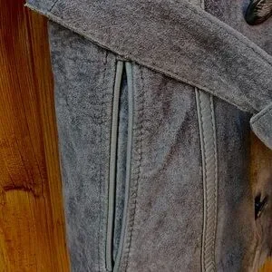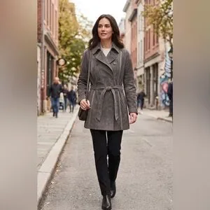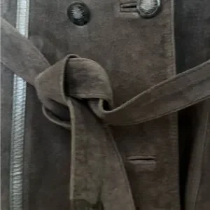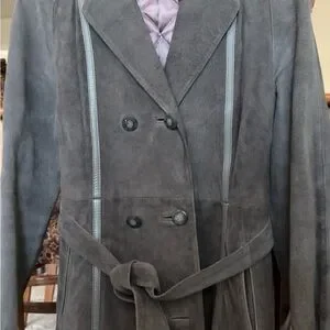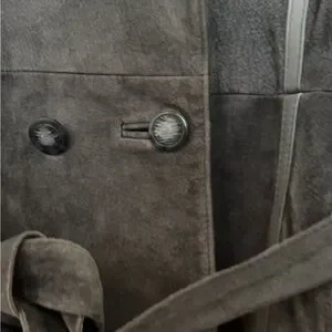 Soft grey coloured suede trench with a double-breasted front and self-tie belt.