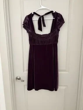Rich velvet mini dress with a tie-back detail. Smocked bust and short puff sleeves. Soft, luxurious fabric with a subtle sheen. Elegant plum color ideal for evening wear.