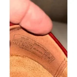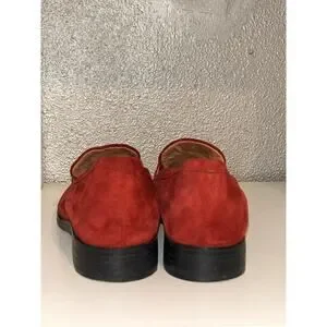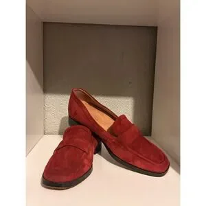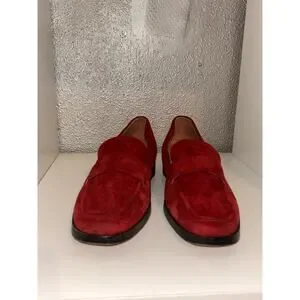 Suede penny loafers with rich red upper. Slip-on style with rounded toe. Black outsole and low stacked heel. Padded footbed for comfort.