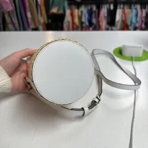 Materials: Woven straw with smooth white leather trim and an adjustable leather crossbody strap (22" drop).