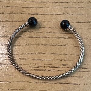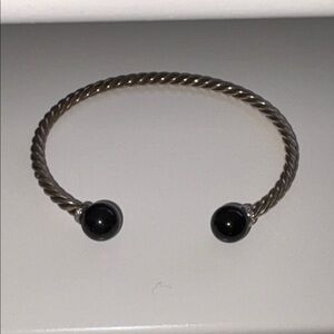Open cuff bracelet with twisted silver-tone wire band. Ends feature glossy black bead accents. Simple, polished design. Easy to stack and wear daily.
