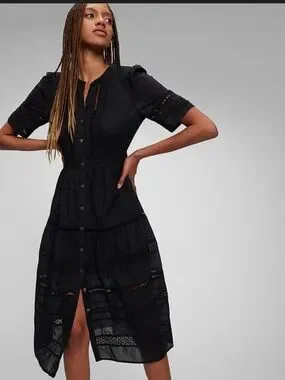 Black lace midi dress by GAP. Button-front closure with delicate lace panels. Short sleeves and a modest round neckline. Feminine scalloped hem and tiered skirt. Easy to dress up or down.