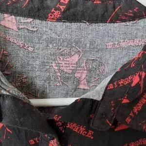 Hot Topic My Chemical Romance Three Cheers for Sweet Revenge woven button-up crop top. Cropped button-up shirt with an allover red graphic print on black. Classic collar and short sleeves. Lightweight, easy-to-style piece. Rayon.