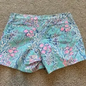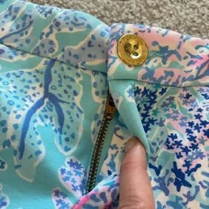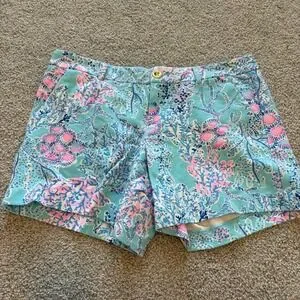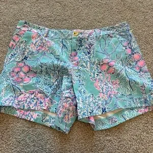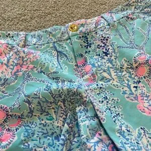 Lilly Pulitzer Callahan shorts showcase a vibrant aquatic coral and sea life pattern in shades of blue, turquoise, and pink. These classic chino-style shorts are crafted from a comfortable stretch ponte fabric, providing a polished look with all-day flexibility.