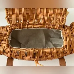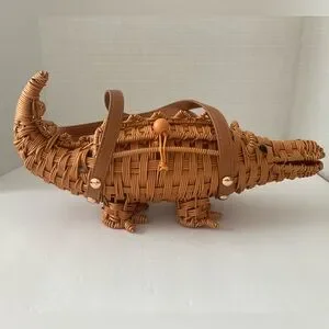 Unique woven crocodile-shaped handbag. Tan wicker body with brown straps and gold-tone stud accents. Playful and sculptural accessory. Lightweight and eye-catching.