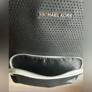 •Perforated Saffiano leather with silver-tone hardware.