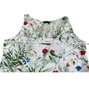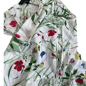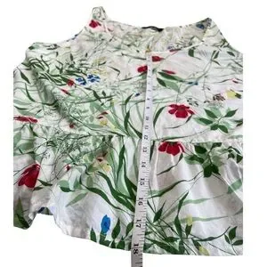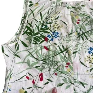 - Color: White base with multicolor floral and botanical print (red, yellow, blue, green)
