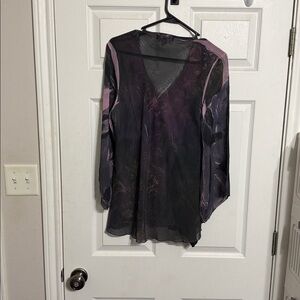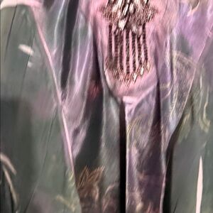 Sheer chiffon blouse with a deep V-neck. Decorative beaded tassel accent at the neckline. Flowing long sleeves and relaxed fit. Subtle purple floral and abstract print on black base. Dressy top suitable for evening or special occasions.
