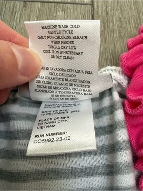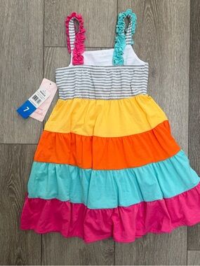 JONA Michelle sleeveless sun dress stripe top multi colored tiers. Grey and white striped top portion with faux bows with buttons. Yellow, orange, blue and pink tiered skirt portion. Has ruffle spaghetti straps in blue and pink. New with tags. Girls size 7.