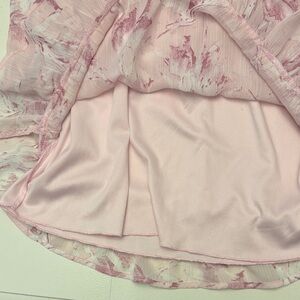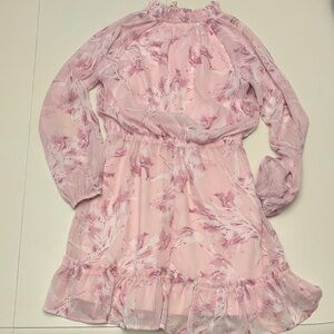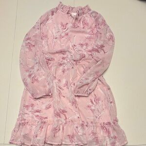 Lightweight pink dress with soft floral print. Elasticized waist and neckline for comfort. Long sheer sleeves with elastic cuffs. Ruffle hem adds playful detail. Easy to wear for casual events.