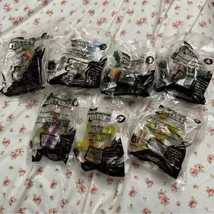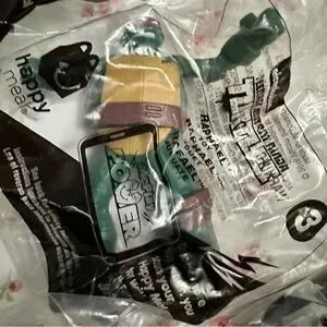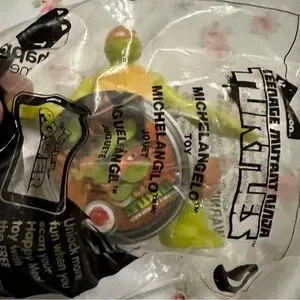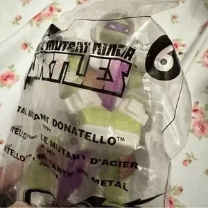 Lot of McDonald's TMNT collectible mini figures in sealed packaging. Bright green turtles with colorful bandana accents. Collectible promotional toys from a fast-food set. Small, fun figures for fans and collectors.