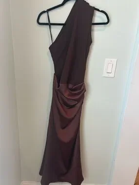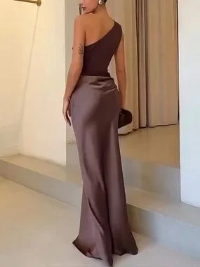 Elegant one-shoulder evening gown in rich chocolate brown. Fitted ruched bodice with a sleek satin skirt. Smooth, floor-length silhouette. Minimal, sophisticated design perfect for formal events.